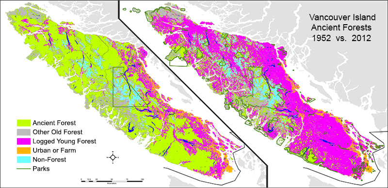 The yellow-green is the original forest cover remaining in 1952. The pink is the logged area. Only a little in 1952; nearly the whole Island in 2012.