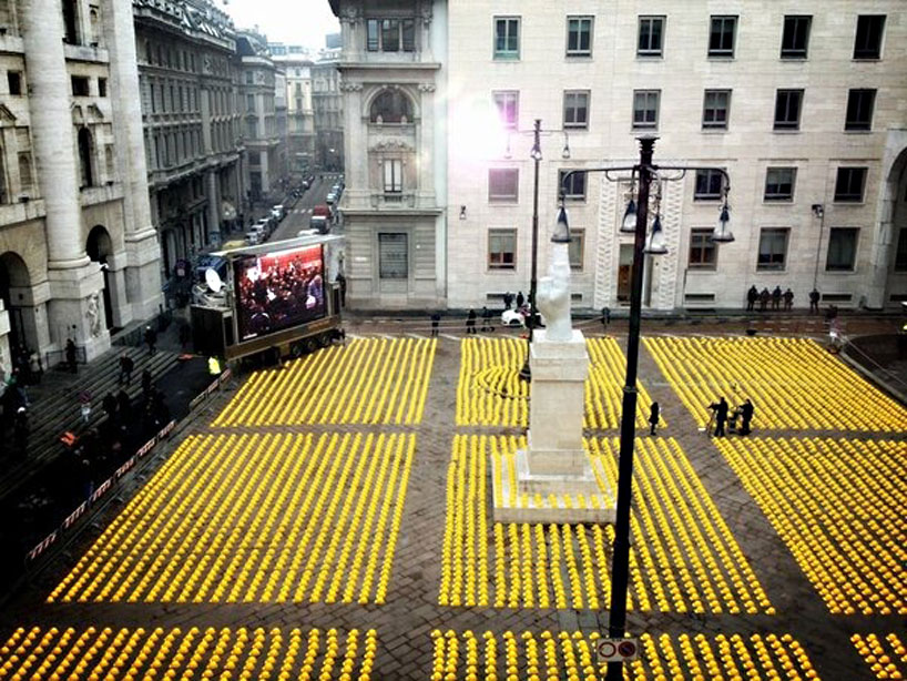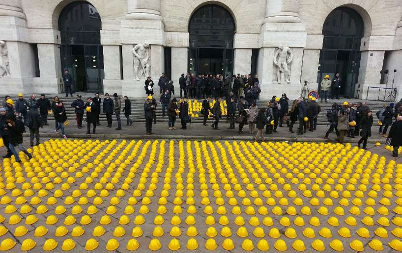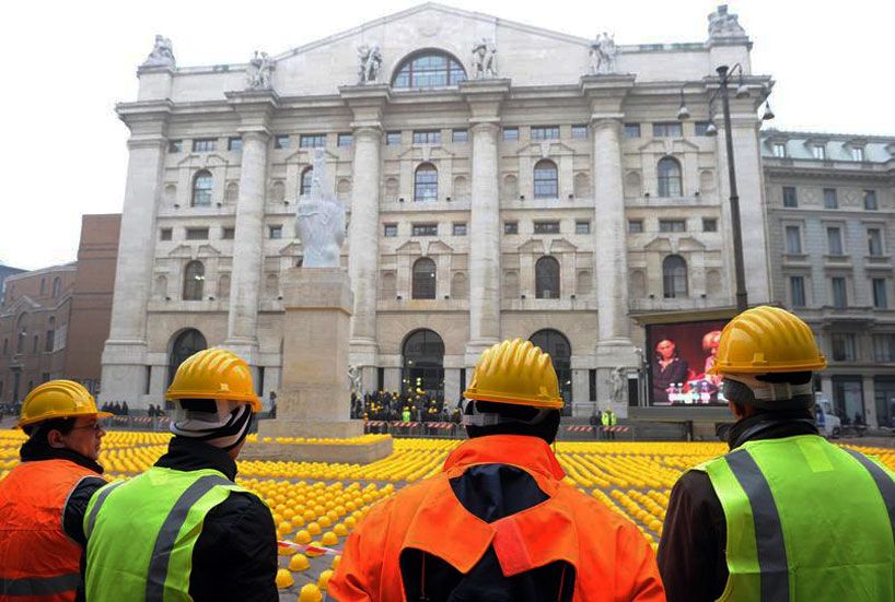 Via designboom. In a “day of anger,” unemployed construction workers hit by Italy’s recession stage brilliant protest outside Milan’s Stock Exchange. For more photos see link.